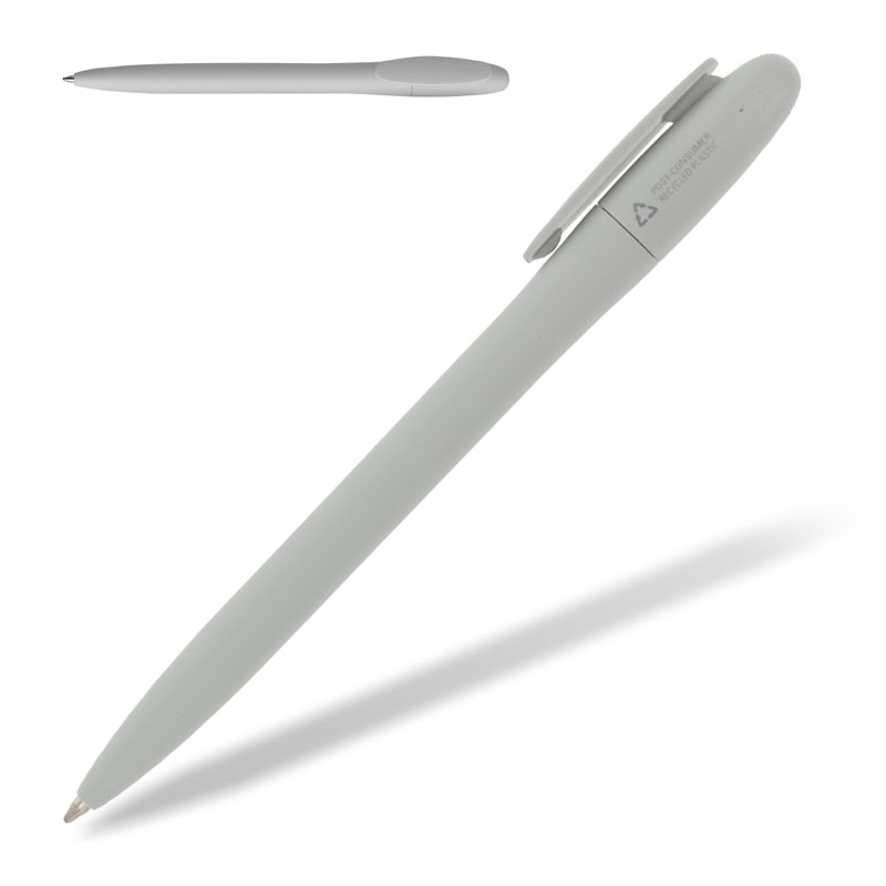 Mit seinen 13,5 cm Länge gehört er zu den zierlicheren Schreibstiften. Er ist ein Drehkugelschreiber mit aufgedrucktem Recycling Logo und dem Text " POST CONSUMER RECYCLED PLASTIC".