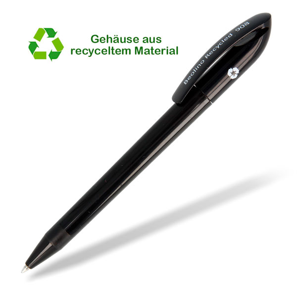 Der BEOLINO Recycled ist ein Markenschreibgerät der Extraklasse. Die hochwertige Qualität bei Burger Swiss Pen wird nun noch unterstrichen, dadurch, dass Schaft und Clipteil aus 100% recyceltem Material in schwarz, weiss oder hellgrau produziert werden. Die Oberflächen sind hochglanzpoliert, kombiniert mit dem zeitlosen, modernen Design unterstreicht es die Exklusivität dieser Markenkugelschreiber. Die Kunststoffspitze ist matt abgesetzt. Der recycelte Kugelschreiber leistet einen Beitrag für die Umwelt, indem er aus wiederverwendbaren Kunststoffen produziert wird. Seine Mine, die durch Drehen am Clipoberteil zum Einsatz kommt, ist durch die lange Schreibleistung von ca. 6.000 m äußerst nachhaltig. Sie ist zertifiziert nach ISO 12757-2 DOC und somit dokumentenecht.