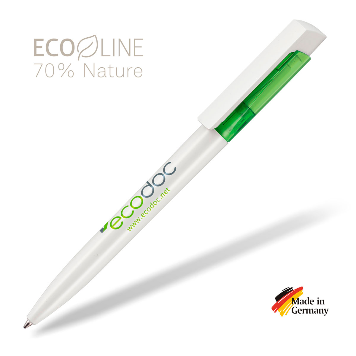 Kronauer Schreibgeräte erweitert sein Programm BIO KUGELSCHREIBER um einen Werbekugelschreiber aus nachwachsendem, biobasiertem Werkstoff Celluloseacetat. Gehäuseschaft und Clip sind aus diesem Naturmaterial gefertigt. Das farbige Oberteil des Produkts ist aus ABS-Kunststoff. Der Artikel BIO-FRESH aus dem Hause Ritter Pen erfüllt zudem alle Anforderungen an ein modernes Werbemittel. Durch sein poliertes Gehäuse erhält er eine glänzend weiße Oberfläche. Die Clipmanschette ist in 32 möglichen Farben wählbar. Sagen Sie uns einach in welcher Druckfarbe wir drucken und wir suchen den passenden Farbton zum Logo.