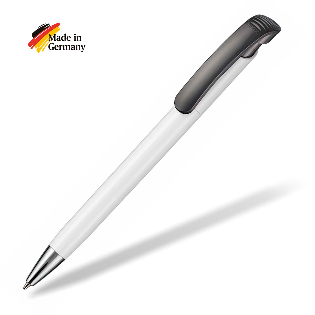 Der Kugelschreiber Bonita ist ein sehr schöner „Allrounder“ aus dem Hause Ritter-Pen. Und natürlich Made in Germany. Die große Druckfläche am Schaft lässt viel Platz für Motive aller Art, die durch die glänzende weiße Fläche auch sehr gut wirken. Nutzen Sie unseren Pen Builder und gestalten Sie sich Ihren Werbekugelschreiber selbst oder schicken Sie uns Ihre Grafik, dann erhalten Sie von uns ein Layout zur Freigabe – natürlich kostenlos.