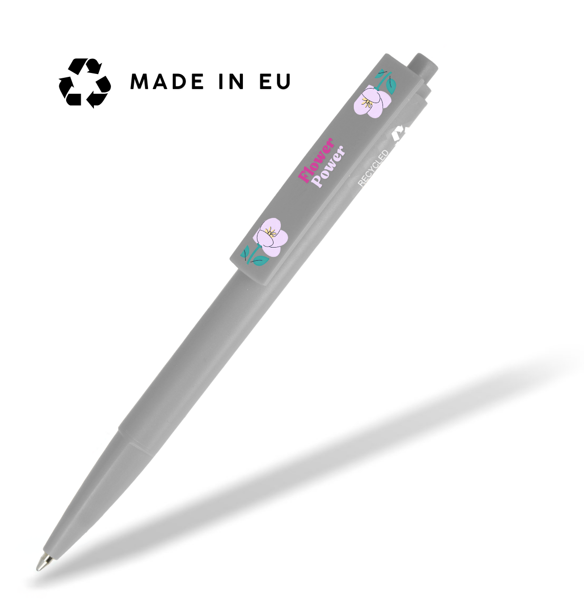 Das ohne Mehrkosten seitlich neben dem Clip angebrachte Recyclinglogo weist auf die Besonderheit des Materials hin.