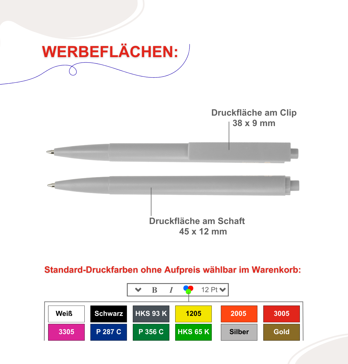 *Alle sichtbaren Gehäuseteile dieses Kugelschreibers sind aus 100% Recyclingmaterial gewonnen. Um homogene Farbtöne zu erzielen werden dem Material ca. 6% nichtrecycelte Standardpigmente zugesetzt. Mine Feder und Mechanik sind aus Standardmaterial.