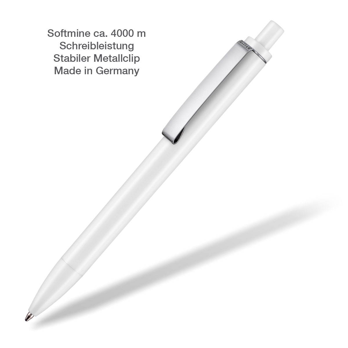 Der EXOS ist ein hochwertiger Werbekugelschreiber aus Kunststoff von Ritter Pen. Der stabile Metallclip und die hohe Materialstärke des Kunststoffgehäuses machen Qualität fühlbar. Ein Schreibgerät das sich Nachhaltigkeit auf die Fahnen geschrieben hat. Die Wertigkeit, Made in Germany, kommt zudem durch die 4.000 m schreibende Softmine zum Ausdruck, die bereits Standard bei diesem Modell ist. Diesen Kugelschreiber bedrucken wir mit Ihrem Logo ein- oder mehrfarbig am Schaft.