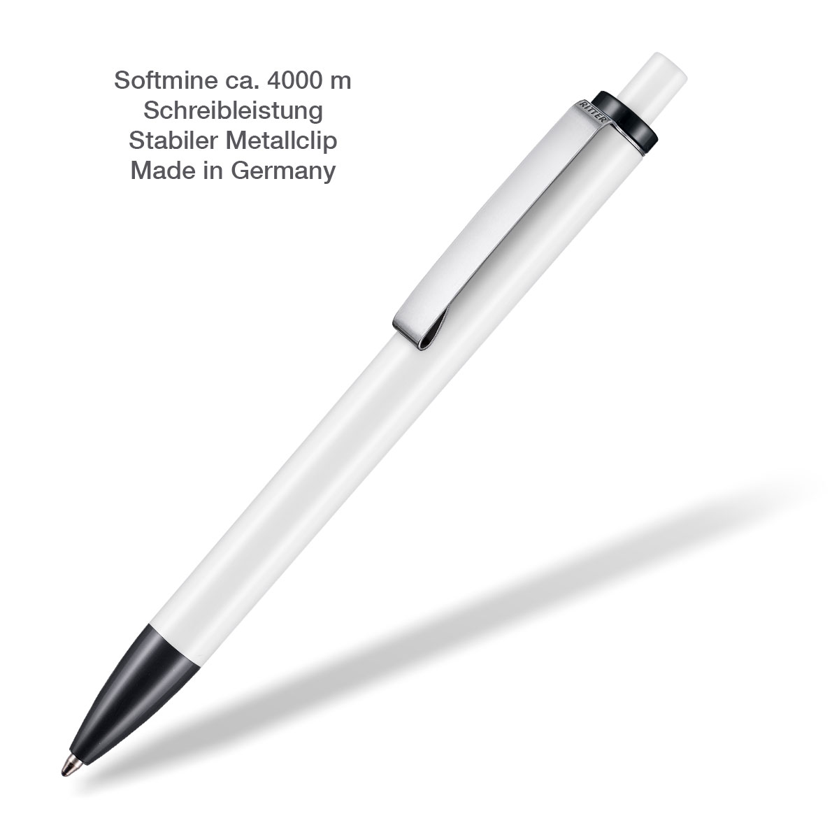 Der EXOS ist ein hochwertiger Werbekugelschreiber aus Kunststoff von Ritter Pen. Der stabile Metallclip und die hohe Materialstärke des Kunststoffgehäuses machen Qualität fühlbar. Ein Schreibgerät das sich Nachhaltigkeit auf die Fahnen geschrieben hat. Die Wertigkeit, Made in Germany, kommt zudem durch die 4.000 m schreibende Softmine zum Ausdruck, die bereits Standard bei diesem Modell ist. Diesen Kugelschreiber bedrucken wir mit Ihrem Logo ein- oder mehrfarbig am Schaft.