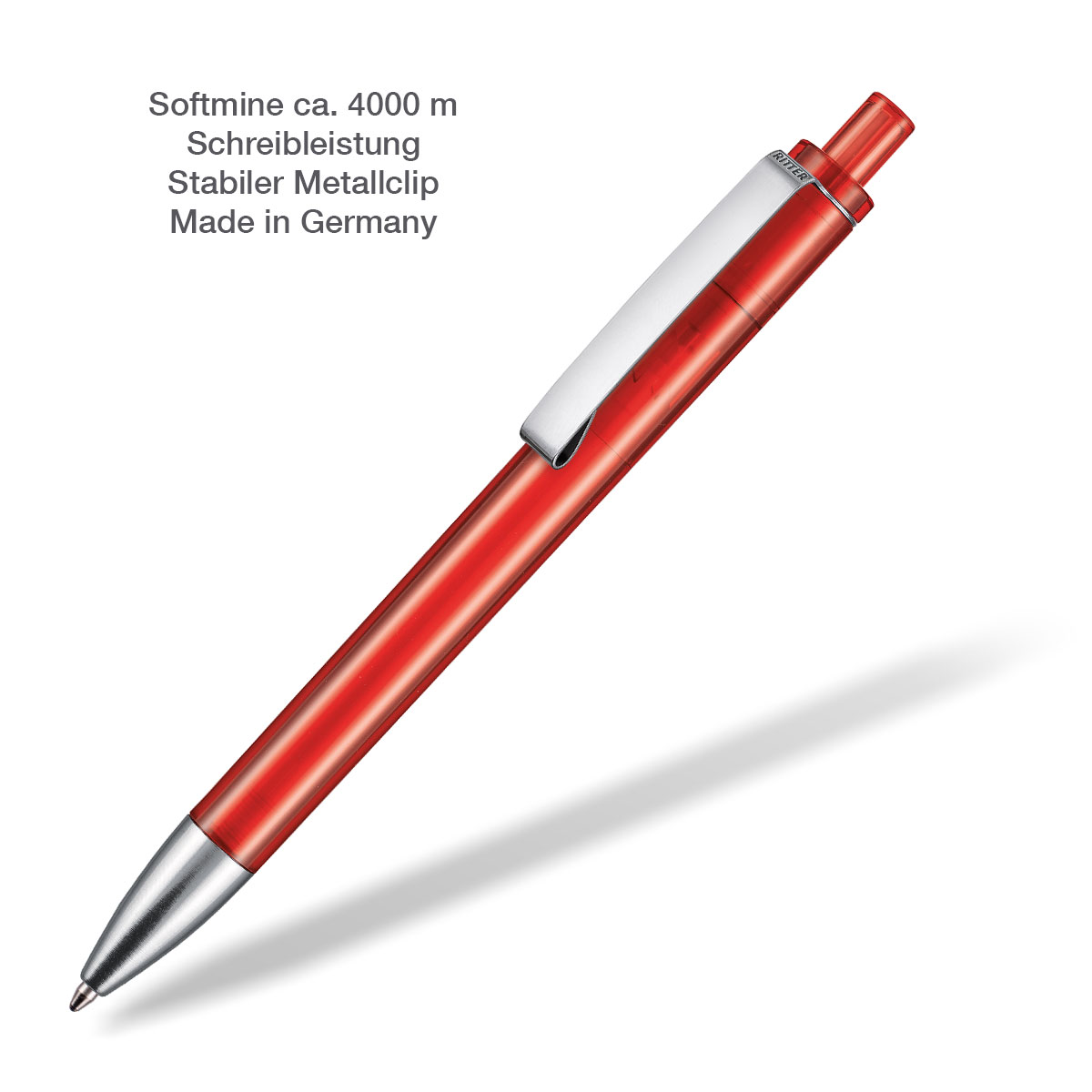Der EXOS Transparent ist ein hochwertiger Werbekugelschreiber aus Kunststoff von Ritter Pen. Der stabile Metallclip, die massive Metallspitze und die hohe Materialstärke des Kunststoffgehäuses, machen Qualität fühlbar. Ein Schreibgerät das sich Nachhaltigkeit auf die Fahnen geschrieben hat. Die Wertigkeit, Made in Germany, kommt zudem durch die 4.000 m schreibende Softmine zum Ausdruck, die bereits Standard bei diesem Modell ist. Diesen Kugelschreiber bedrucken wir mit Ihrem Logo ein- oder mehrfarbig am Schaft.