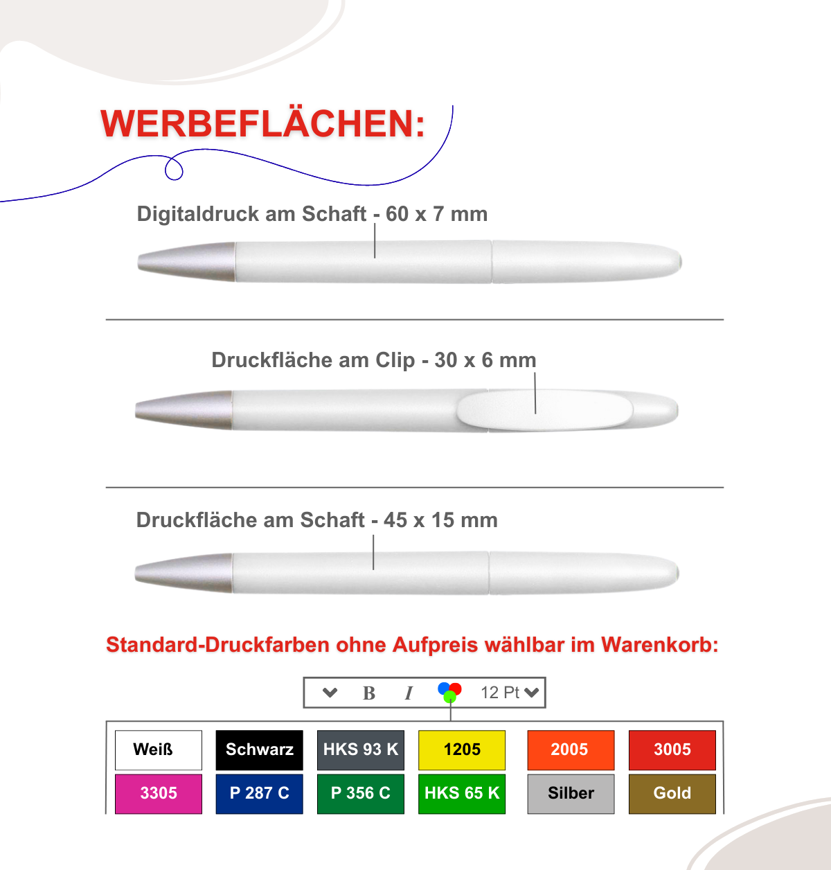 Sehr groß ist bei diesem Werbekugelschreiber die angebotene Auswahl an Volltonfarben die als Standardpalette ohne Aufpreis lieferbar sind. Ihre Anforderungen an das CI können so meist erfüllt werden. Wenn Sie über 20.000 Stück benötigen, können wir das Gehäuse sogar in Sonderfarbe nach Pantone speziell für Sie anfertigen lassen.