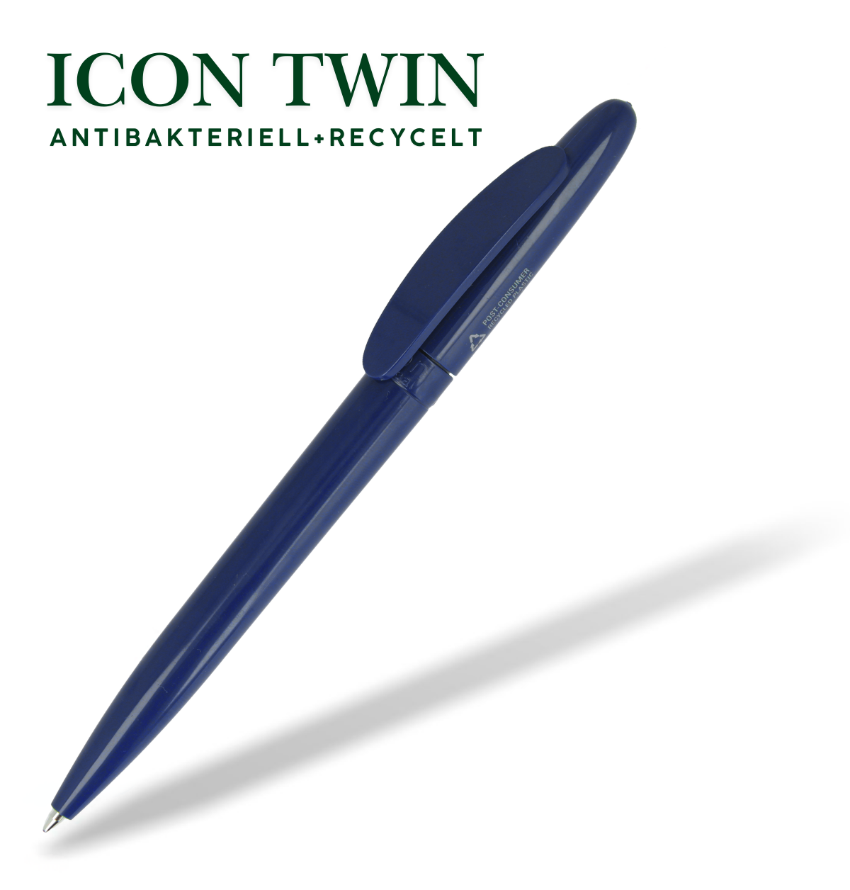 Werbekugelschreiber aus recyceltem Material mit antibakterieller Oberfläche. Nachhaltigkeit und Hygienesicherheit in einem Produkt vereint. Für die Produktion der Gehäuseteile wird 100% post-consumer-recyceltes Material verwendet. Ein spezielles ISO-22196:2011 Additiv (Silberionen), hemmt das Wachstum von Bakterien und bietet guten Schutz gegen Bakterien. Ein Werbeartikel geht durch viele Hände. Jetzt "2 Fliegen mit einer Klappe schlagen".