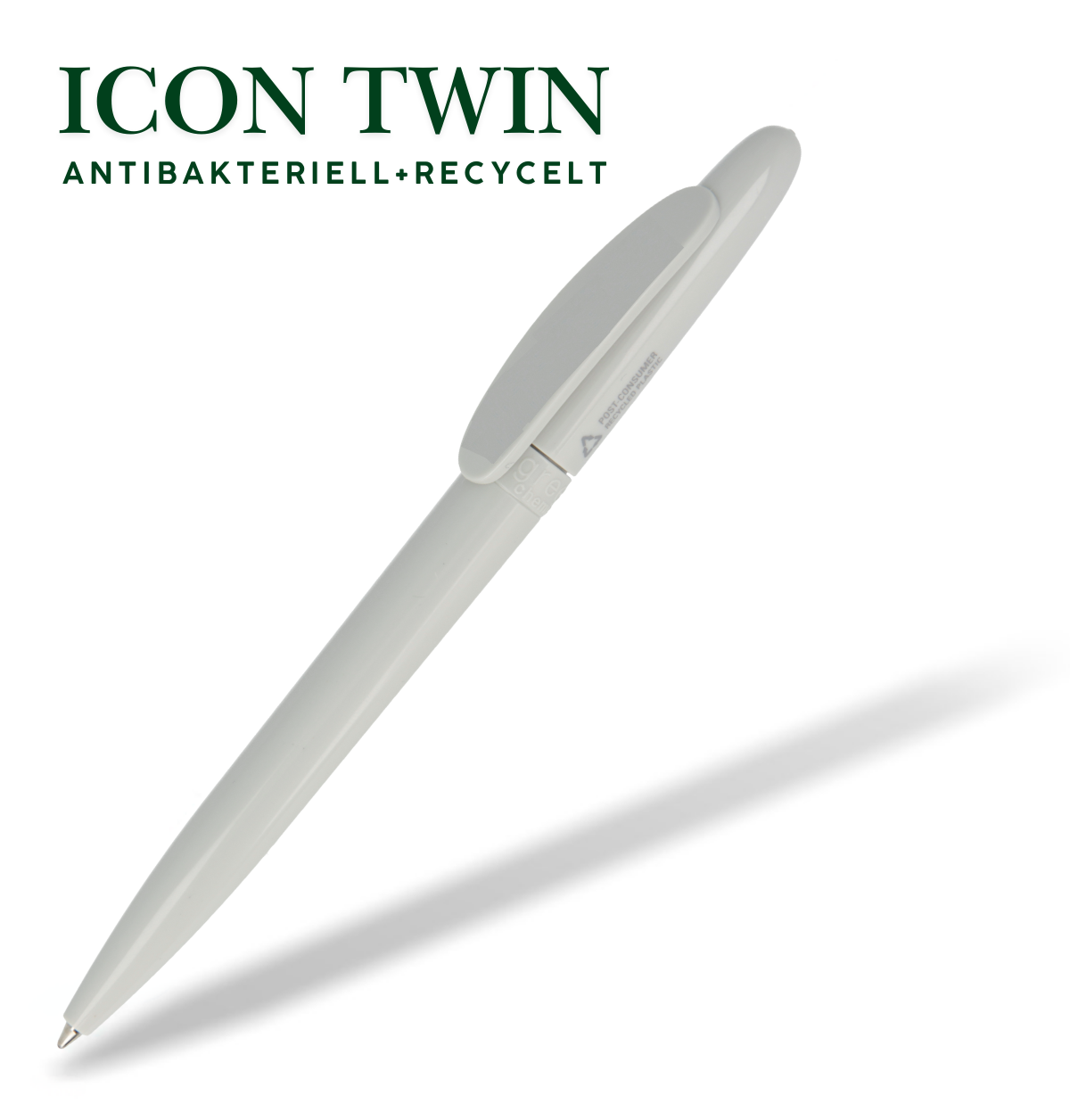 Werbekugelschreiber aus recyceltem Material mit antibakterieller Oberfläche. Nachhaltigkeit und Hygienesicherheit in einem Produkt vereint. Für die Produktion der Gehäuseteile wird 100% post-consumer-recyceltes Material verwendet. Ein spezielles ISO-22196:2011 Additiv (Silberionen), hemmt das Wachstum von Bakterien und bietet guten Schutz gegen Bakterien. Ein Werbeartikel geht durch viele Hände. Jetzt "2 Fliegen mit einer Klappe schlagen".