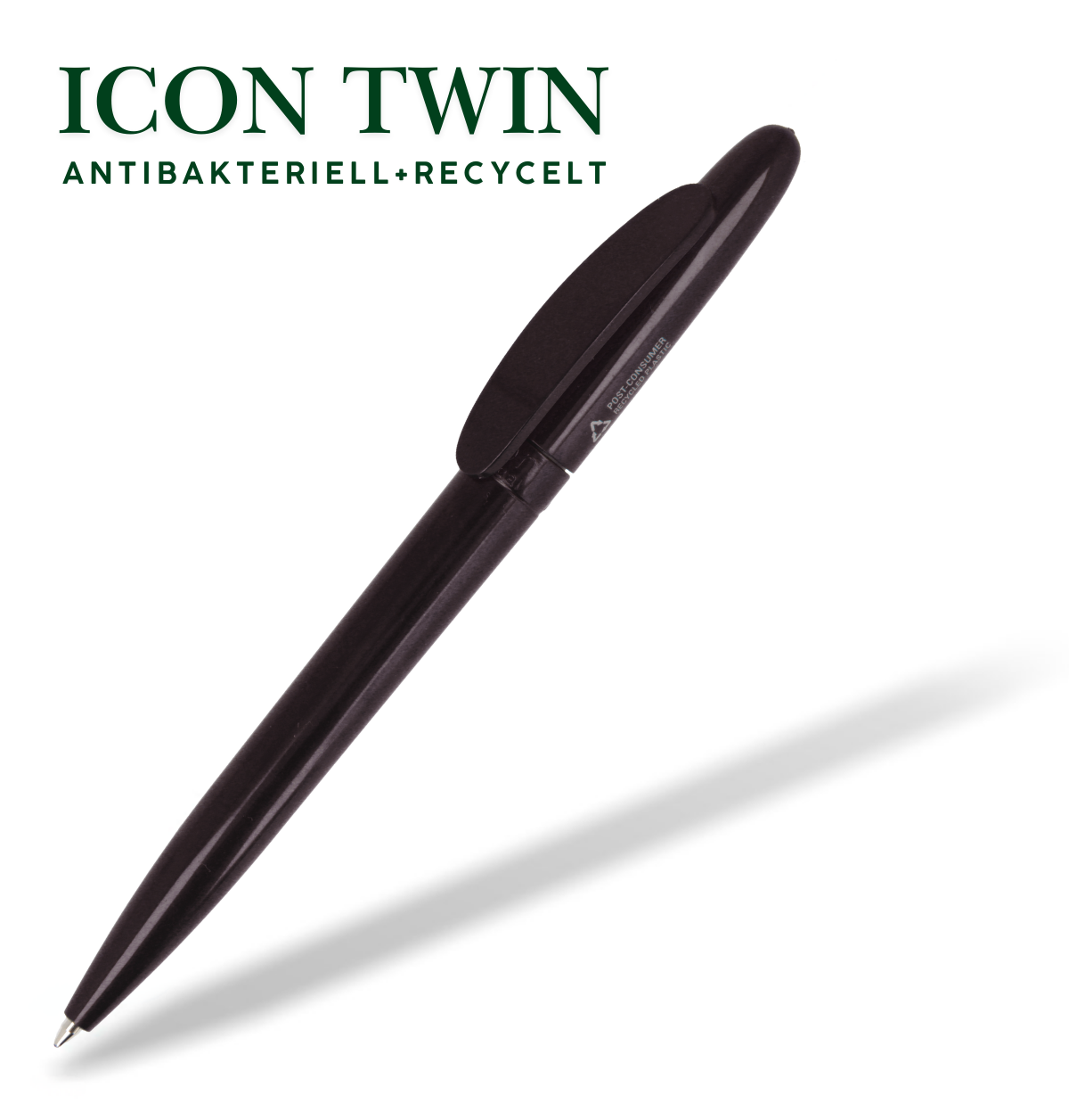 Werbekugelschreiber aus recyceltem Material mit antibakterieller Oberfläche. Nachhaltigkeit und Hygienesicherheit in einem Produkt vereint. Für die Produktion der Gehäuseteile wird 100% post-consumer-recyceltes Material verwendet. Ein spezielles ISO-22196:2011 Additiv (Silberionen), hemmt das Wachstum von Bakterien und bietet guten Schutz gegen Bakterien. Ein Werbeartikel geht durch viele Hände. Jetzt "2 Fliegen mit einer Klappe schlagen".