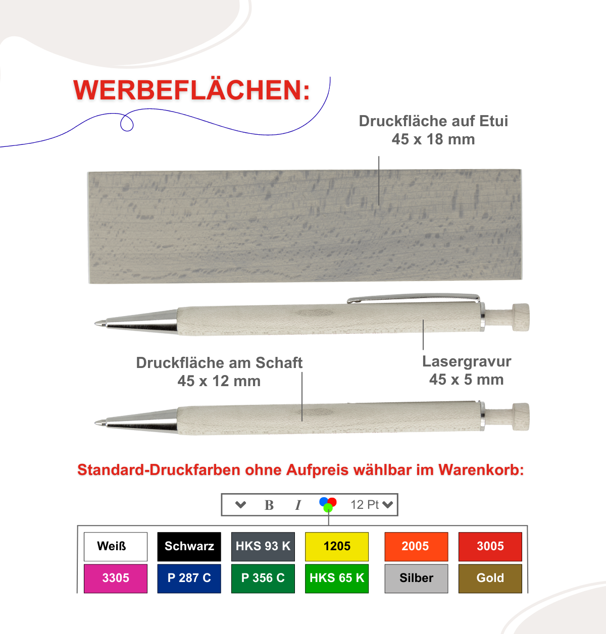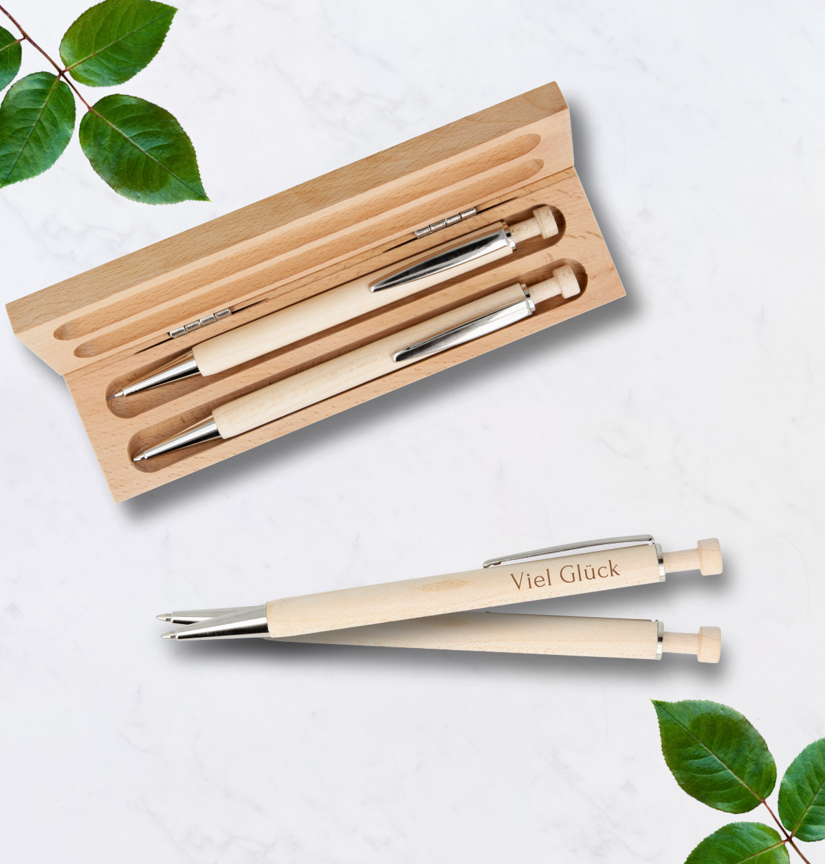 Das Schreibset MALENTE ist ein gern überreichtes Werbegeschenk in edlem Holz Design. Werbung auf dem hellen Ahornholz ist nachhaltig und umweltbewusst und bleibt durch die vielseitige Nutzung langanhaltend in Erinnerung. Der Werbeartikel setzt sich aus 3 Teilen zusammen: Der Kugelschreiber mit Metallclip und blauschreibender Mine, der Druckbleistift ebenfalls mit Metallclip und das passende Etui mit 2 Einlegefächern. Alle drei Teile können bedruckt oder mit einer Lasergravur veredelt werden. Bei Bestellung dieses Artikels erhalten Sie ein sofort überreichbares Präsent, das zum Beispiel auch mit einer Einzelnamensgravur - individueller Name des Geschenkempfängers - versehen werden kann.