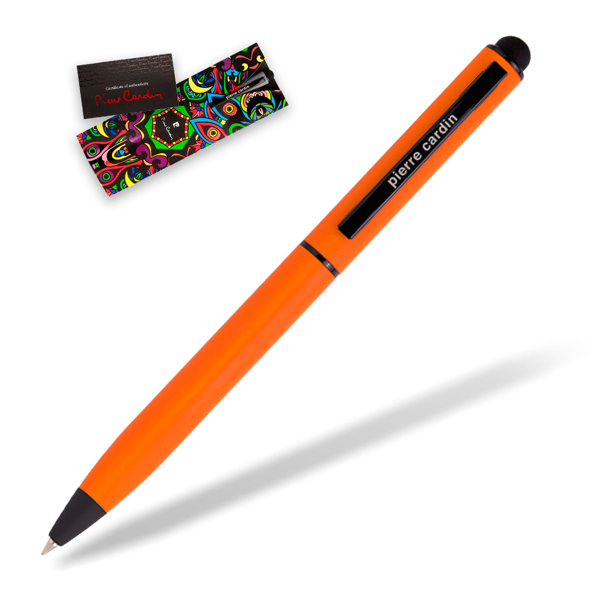 Markenkugelschreiber CELEBRATION von Pierre Cardin. Ein modisch eleganter Drehkugelschreiber mit schwarzen Applikationen. Das Gehäuse hat eine angenehm griffige Soft-Touch Oberfläche. Der blauschreibende Kugelschreiber ist auch als Toch-Pen für Smarthpones und Tablets nutzbar. Ein exklusives Markenprodukt, verpackt im Pierre Cardin Kartonschuber mit Echtheitszertifikat. Ihre Werbung als hochwertige Lasergravur – auch mit Einzelnamen nach Excelliste.
