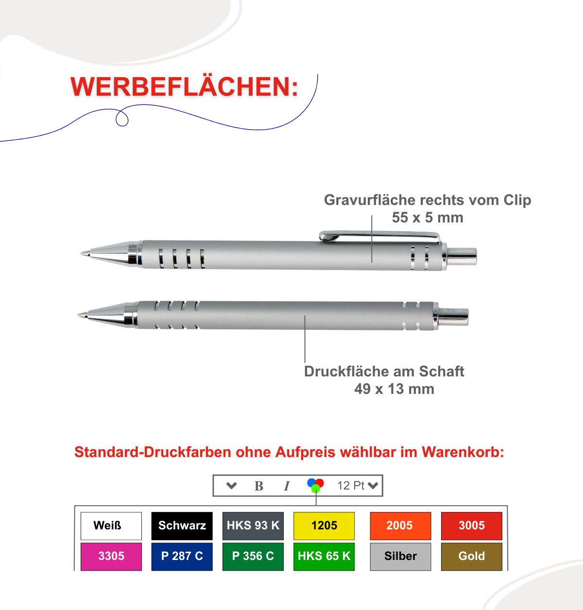 Unser ROXTER ist ein edler Metallkugelschreiber und ein absoluter Bestseller in unserem Werbeartikel-Sortiment. Die matt satinierte Oberfläche bietet ideale Voraussetzungen für farbige Logos direkt auf dem Schaft und verleiht dem Schreibgerät eine hochwertige Optik. Als zusätzliche Veredelung bieten wir eine Gravur an, um individuelle Namens- oder Firmennamen besonders elegant zu platzieren.