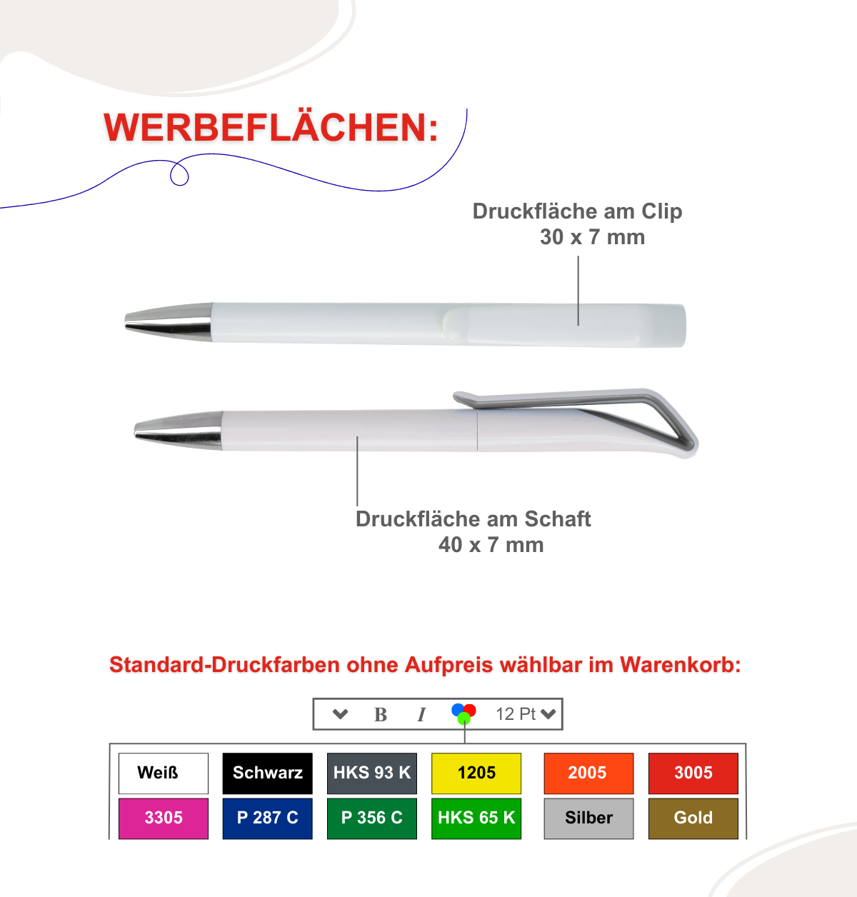 Unser Drehkugelschreiber SAVONA zeichnet sich durch ein modernes und ansprechendes Design aus. Auffällig läßt sich durch die großen Werbflächen ein mehrfarbiges Logo platzieren. Die bunten Applikationen am Clip sind in obigen Farben lieferbar. Eine blauschreibende Mine mit guten Schreibeigenschaften runden den Gesamteindruck dieses schicken Werbeträgers ab. Gerne beraten wir Sie zur Gestaltung Ihres Werbedrucks und fertigen für Sie ein kostenloses Layout.