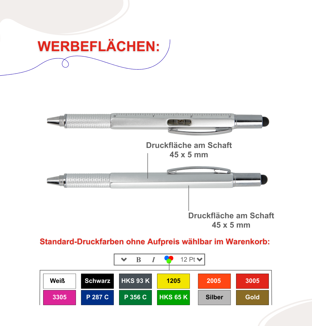 Im Multifunktionskugelschreiber Science aus Kunststoff steckt alles drin, was man braucht. Er ist ein echter Technik-Pen mit einer Wasserwaage und einem Lineal. Das Linieal verfügt über eine Zentimeter Skala bis 7 und eine Zoll Skala bis 3. Ein Bit-Set mit Kreuz und Schlitz ist im oberen Teil des Kugelschreibers zu finden. Hierzu muss nur die Kappe abgedreht werden (Schraubverschluss). Auch die Touch-Funktion für die Nutzung am Smartphone und Tablet fehlt bei diesem Vielkönner nicht. Die Schreibfarbe ist schwarz. Die Mine wird mittels Drehmechanismus herausgedreht. Dieser vielfältig nutzbare Kugelschreiber hat die Maße 145 x 10 x 15 mm und wiegt 13 g.
