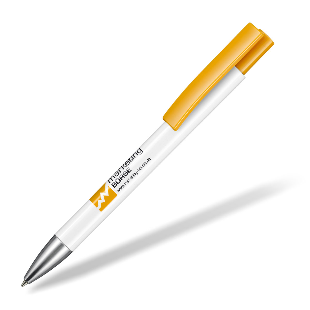 Durch die Variantenvielfalt wird aus dem Markenkugelschreiber STRATOS von Ritter Pen ein ganz individueller Werbekugelschreiber, abgestimmt auf Werte, die Sie als Unternehmen vermitteln möchten. Das Materialgewicht, die Metallspitze, die qualitativ hochwertige Verarbeitung des Kugelschreibers und die Mine bewirken ein angenehmes Schreibgefühl auf lange Zeit.