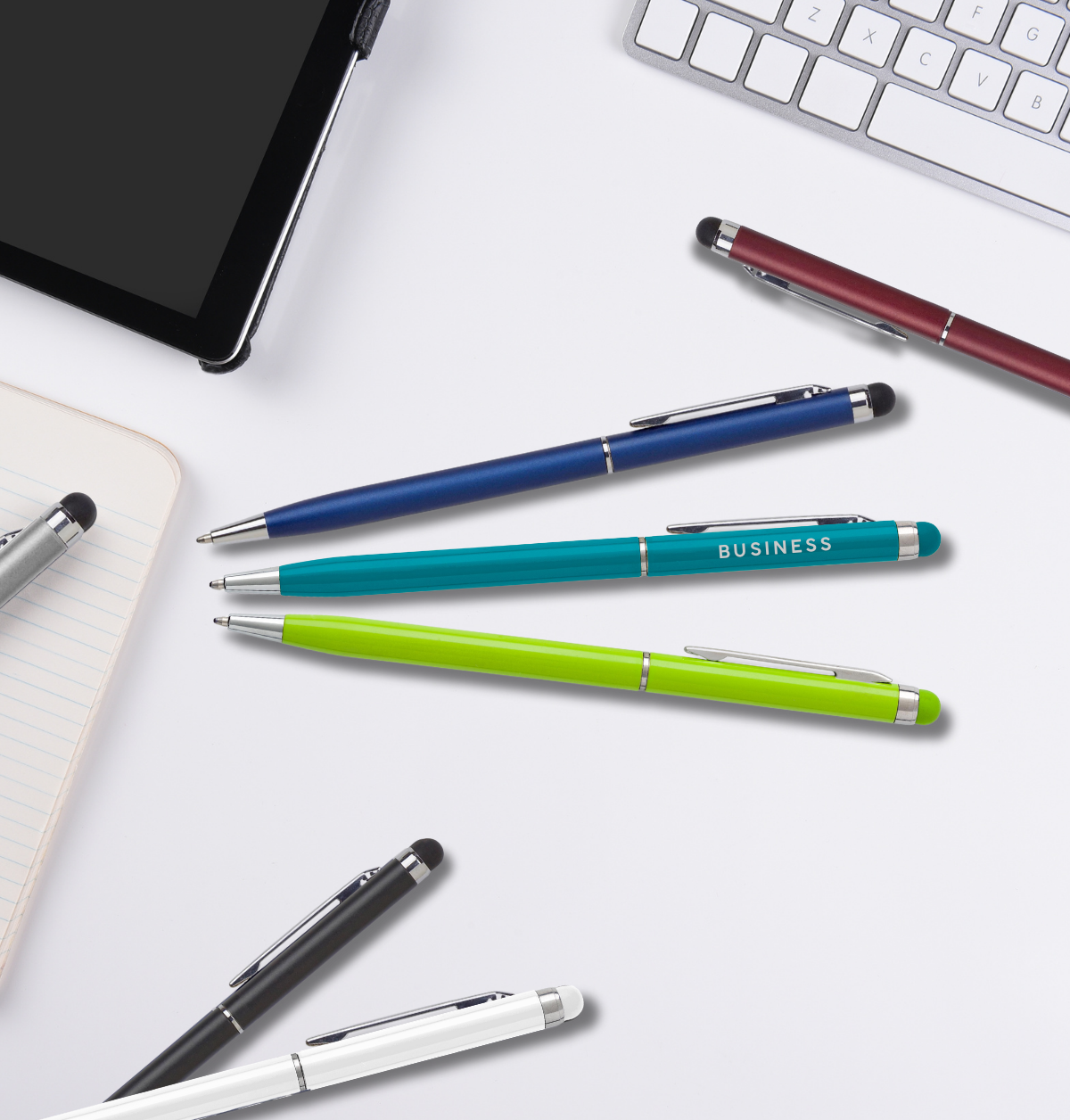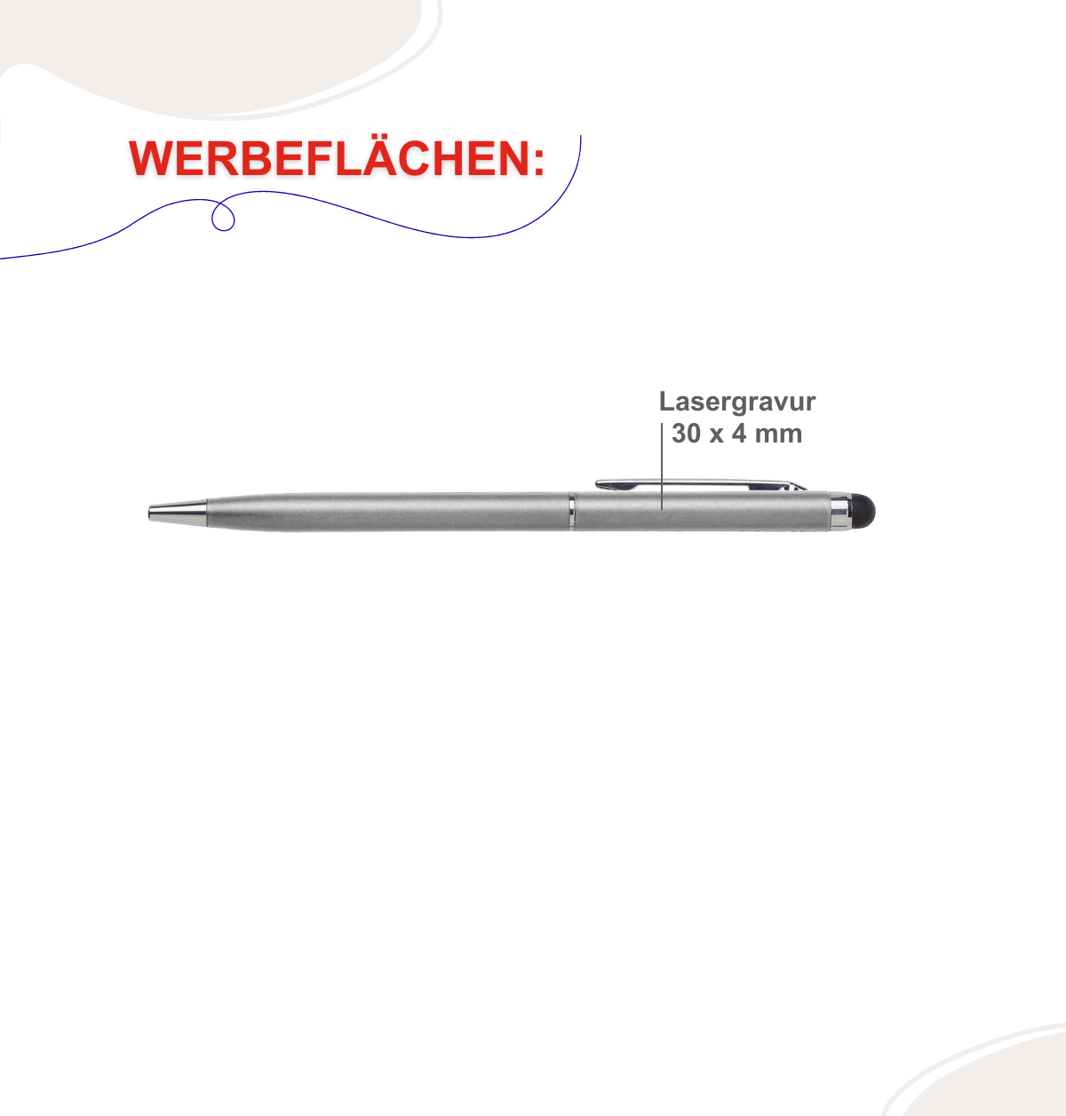 Der Kugelschreiber SWAY liegt mit seinem schlicht, eleganten Gehäuse aus Aluminium ganz im Trend. Der Metallclip rundet das Design optimal ab und hebt die Wertigkeit des Stifts. Er präsentiert sich in vielen verschiedenen Farben. Der Touch-Pen ist farblich an die Gehäusefarbe angepasst. Die Mine des Metallkugelschreibers schreibt blau und wird mit Drechmechanismus auf- und zugedreht. Seine schlanken Maße liegen bei 135 x 8 x 10 mm mit einem Gewicht von 13 g.