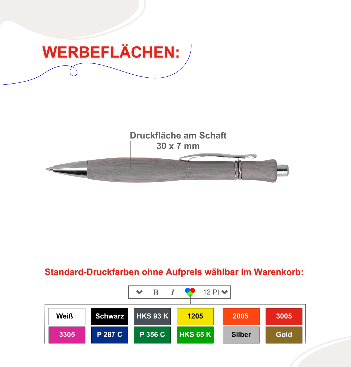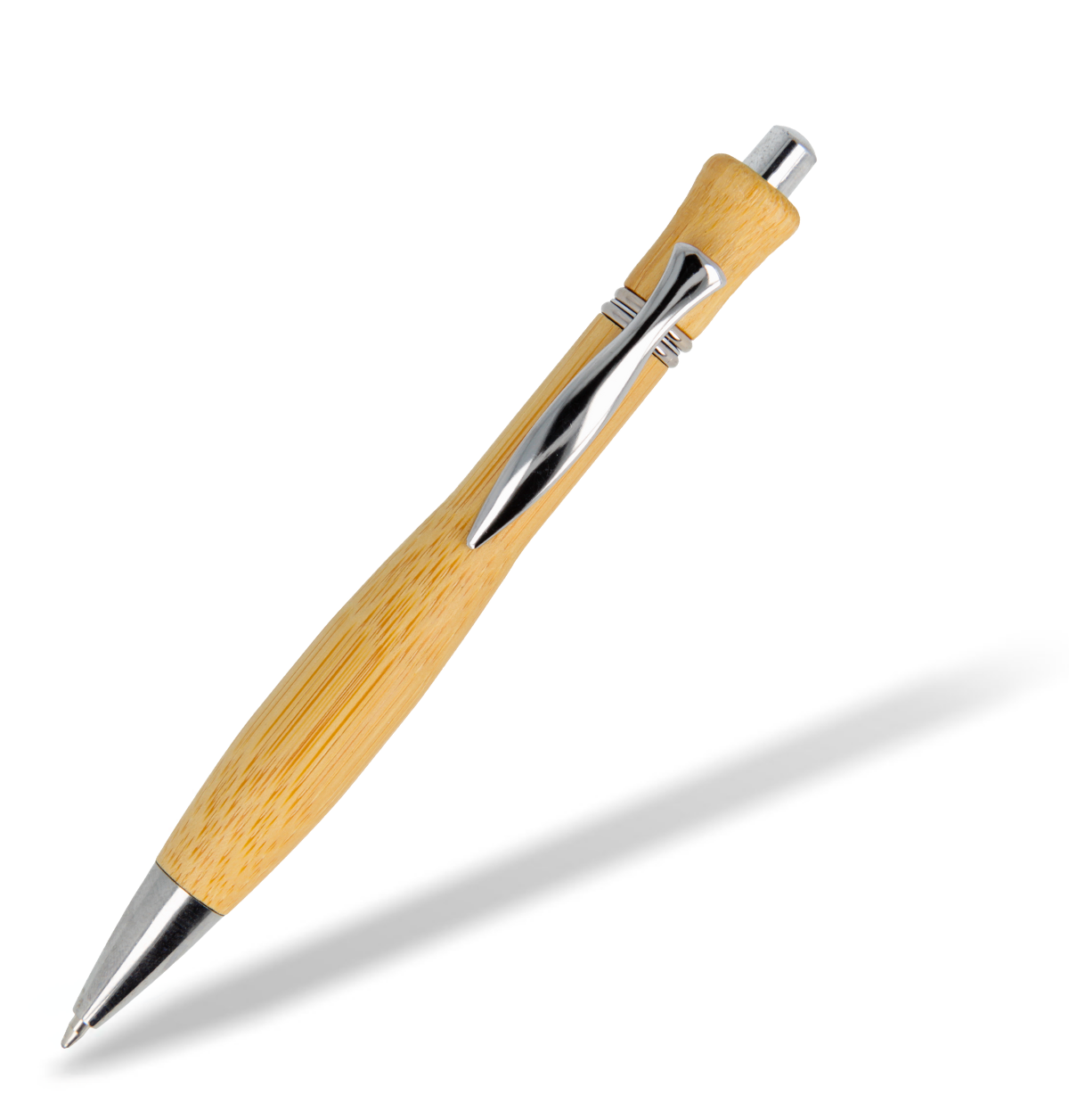 Unser Bambus Kugelschreiber Talesta ist ein schickes und günstiges Schreibgerät mit Metallbeschlägen. Die außergewöhnliche Form ist ein Hingucker und verleitet zum Schreiben. Die schwarzschreibende Mine bewegt sich flüssig über das Papier. Ein Werbeartikel, ideal für eine Bedruckung mit Ihrem Logo.